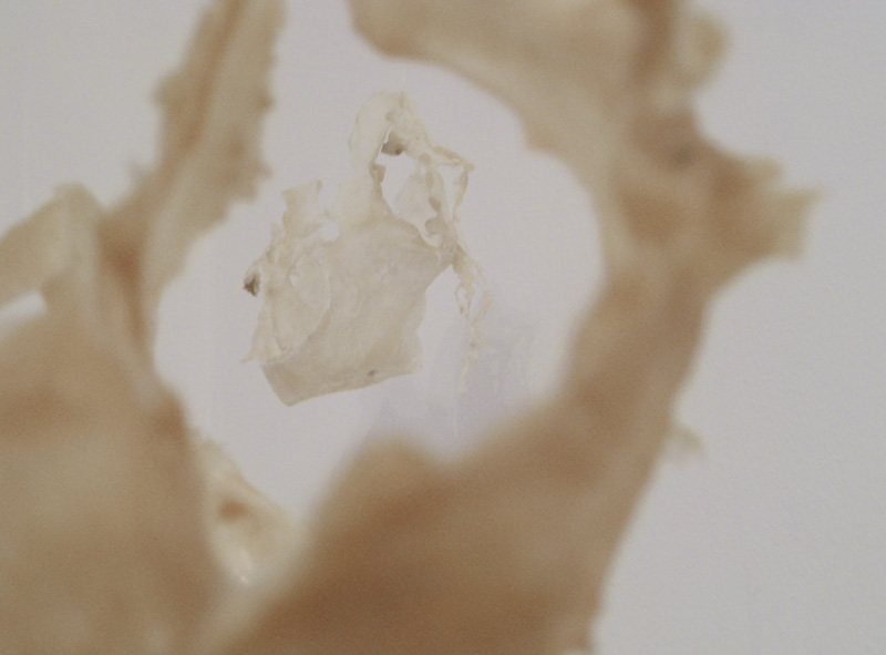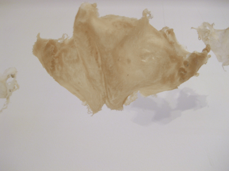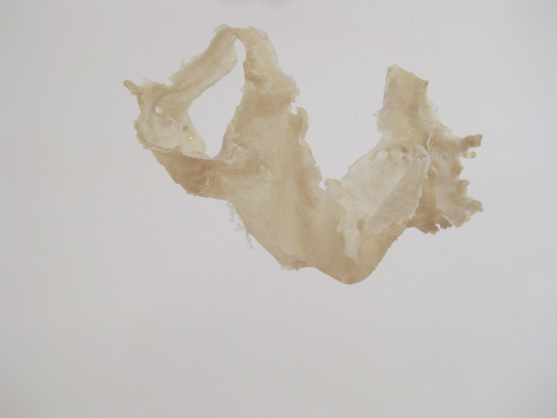 Die Beweglich- und Leichtigkeit der Latexobjekte schafften einen Kontrast zum leblosen Ausgangsmaterial.  Mit meiner Rauminstallation löste ich die Zwischenformen aus dem ursprünglichen Kontext heraus. Es war mir wichtig die gleiche Form immer wieder zu reproduzieren. Das manuell Reproduzierte verstärkte und verdinglichte den Zwischenraum des imaginierten Raumes.