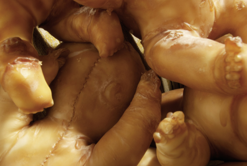 Aus Latex kreierte ich eigene Putten. Meine alte Lieblingspuppe war Model dafür. Es entstanden 34 Latexhüllen, welchen ich mit Füllmaterial Leben einhauchte. Meine Putten waren nackt und hatten weder Flügel, Haare noch irgendwelche Gegenstände. Einzig ihre Funktion blieb die ursprüngliche, sie sollten verführen. Jede Putte hatte einen individuellen Ausdruck und war in Farbigkeit und in der Formvollendung subtil verschieden.