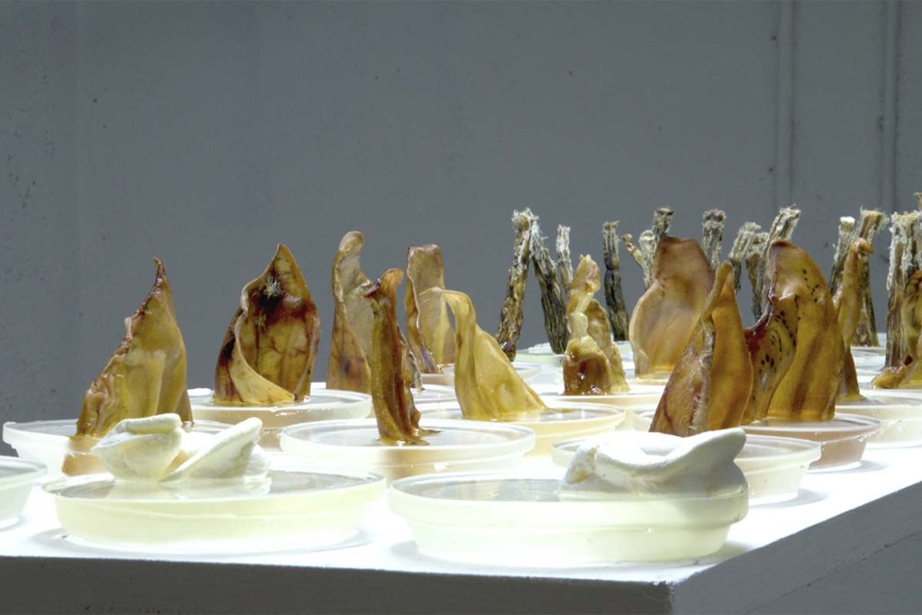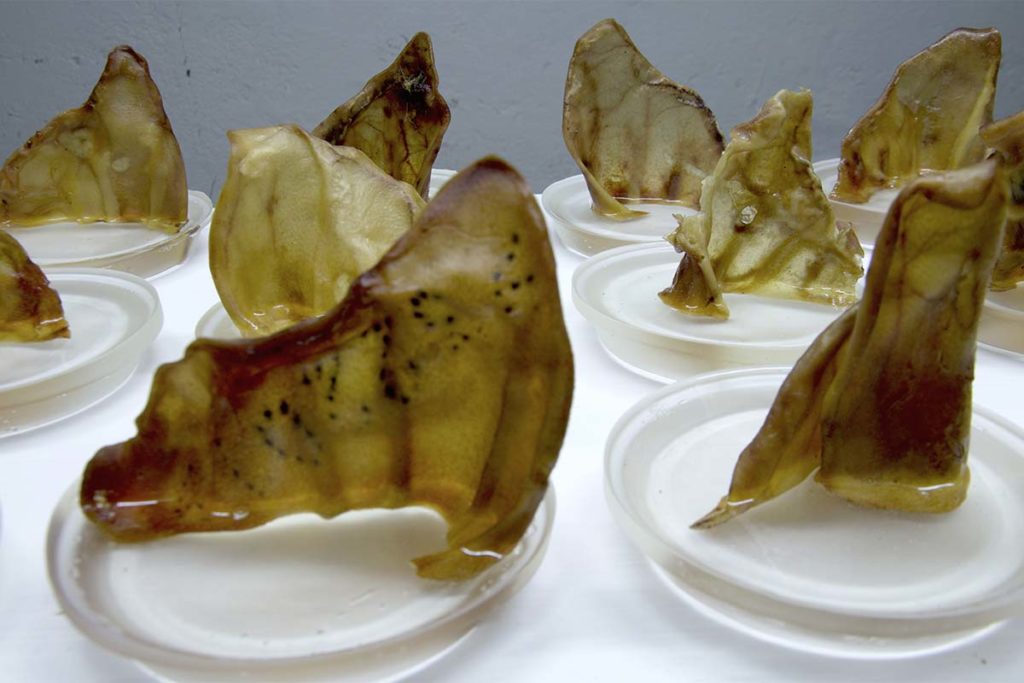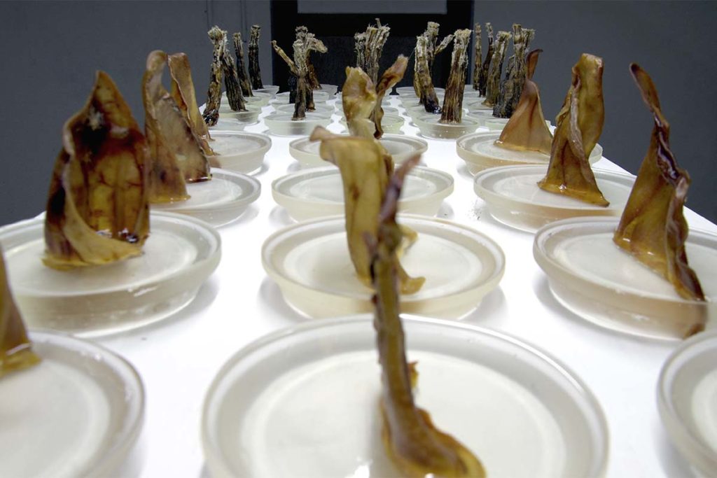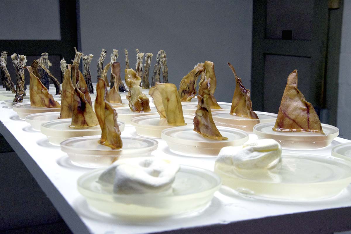Ich verwende getrocknete Schweineohren, Ochsenschwänze und Schweineschnauzen um eine Metamorphose eines leblosen und unwichtigen Produktes in eine neue ästhetische Form zu bringen. Tierische Abfallprodukte, welche Hunden zum Frass vorgelegt werden, werden so inszeniert, dass sie in ihrer Form als schön und interessant verstanden werden, eine unerwartete Bedeutsamkeit entsteht. Durch die Anordnung und die Lichtführung werden neue Formen und Assoziationen hervorgerufen, welche die Betrachtenden durch die vertrauten organischen Strukturen neugierig macht und das Abtauchen in die andere, unbekannte Welt erlaubt, eine Paradoxie.