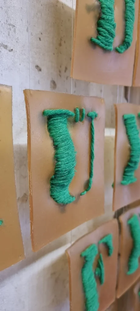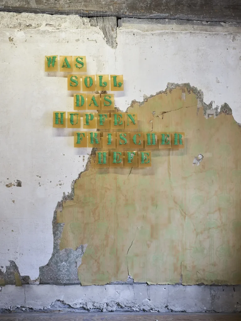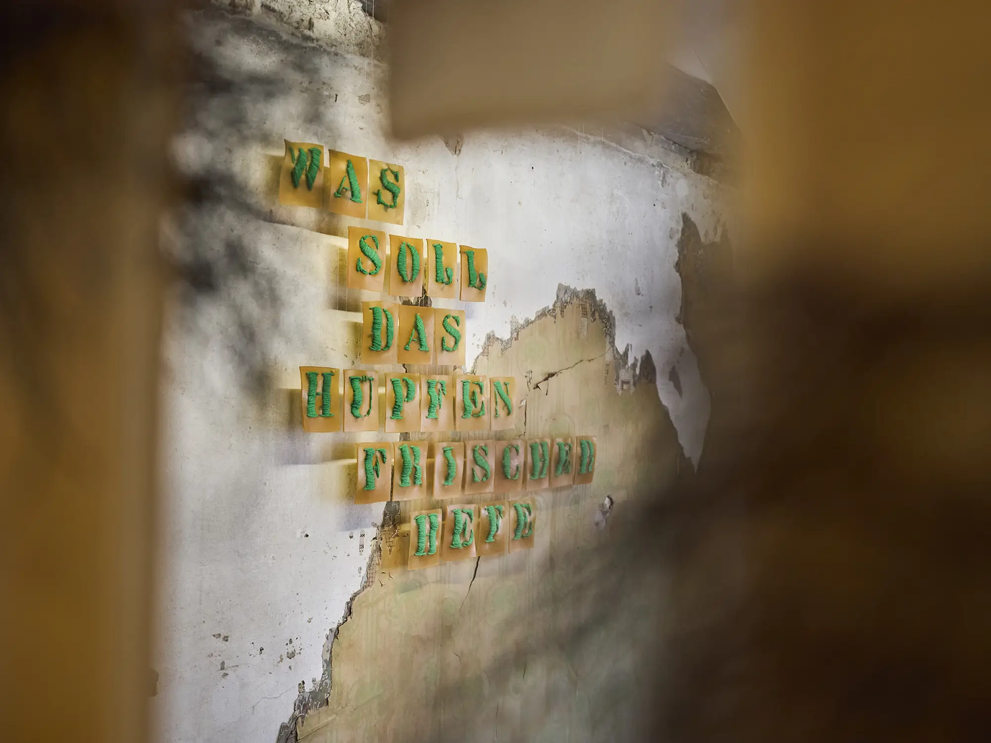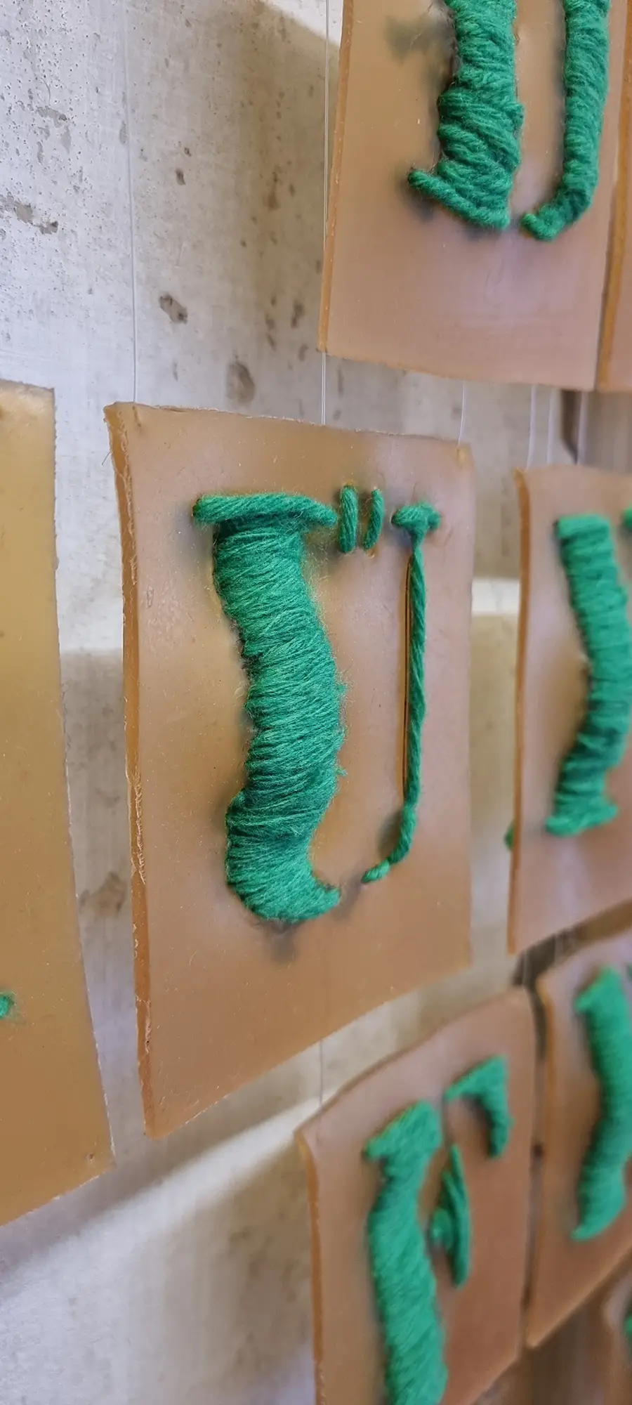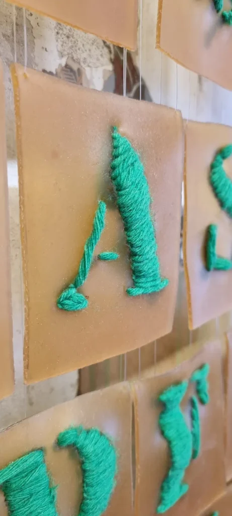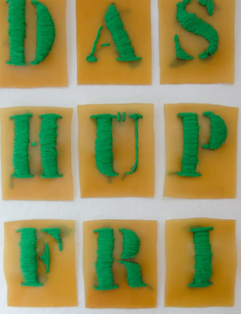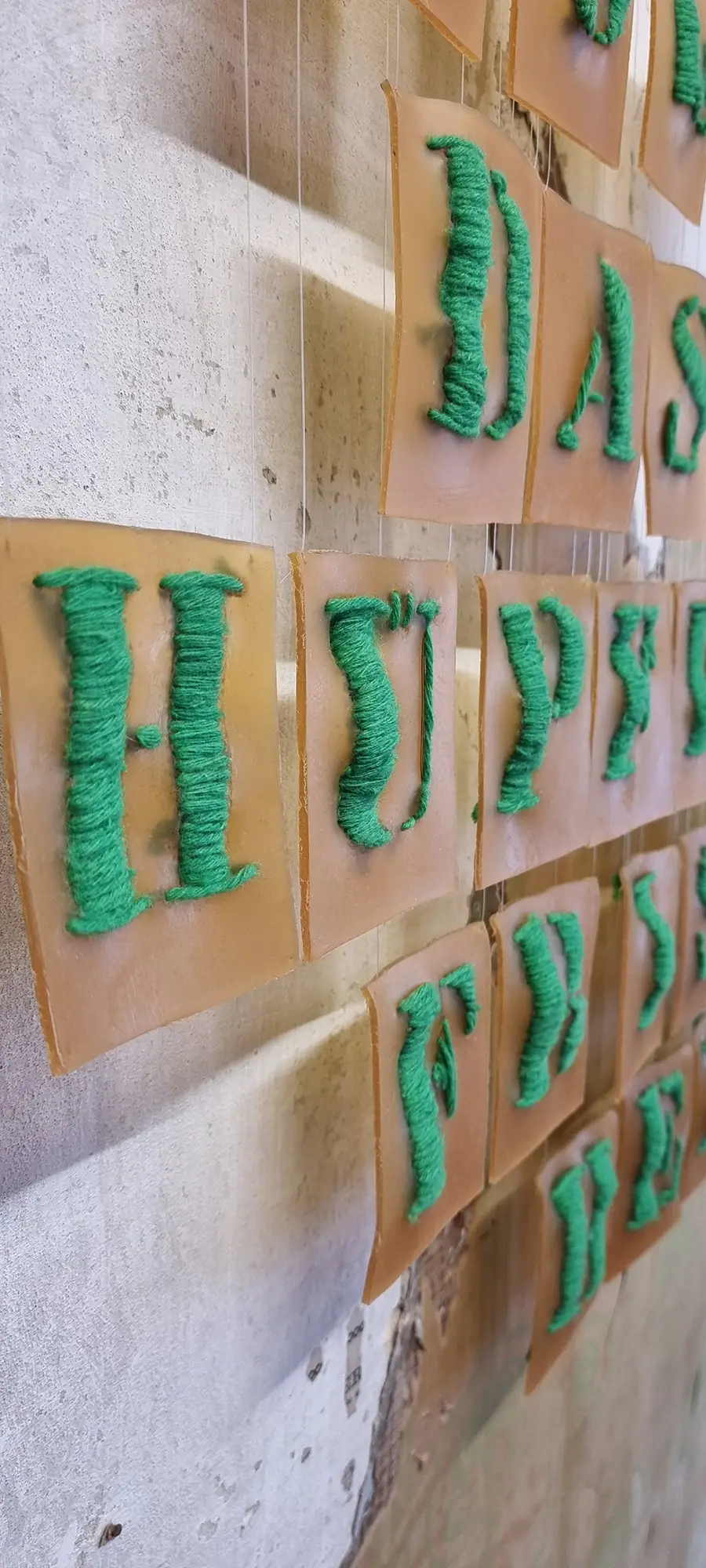 Material: Installation aus 28 Buchstaben gestickt Latexgummimilch, Wolle, Nylonfaden